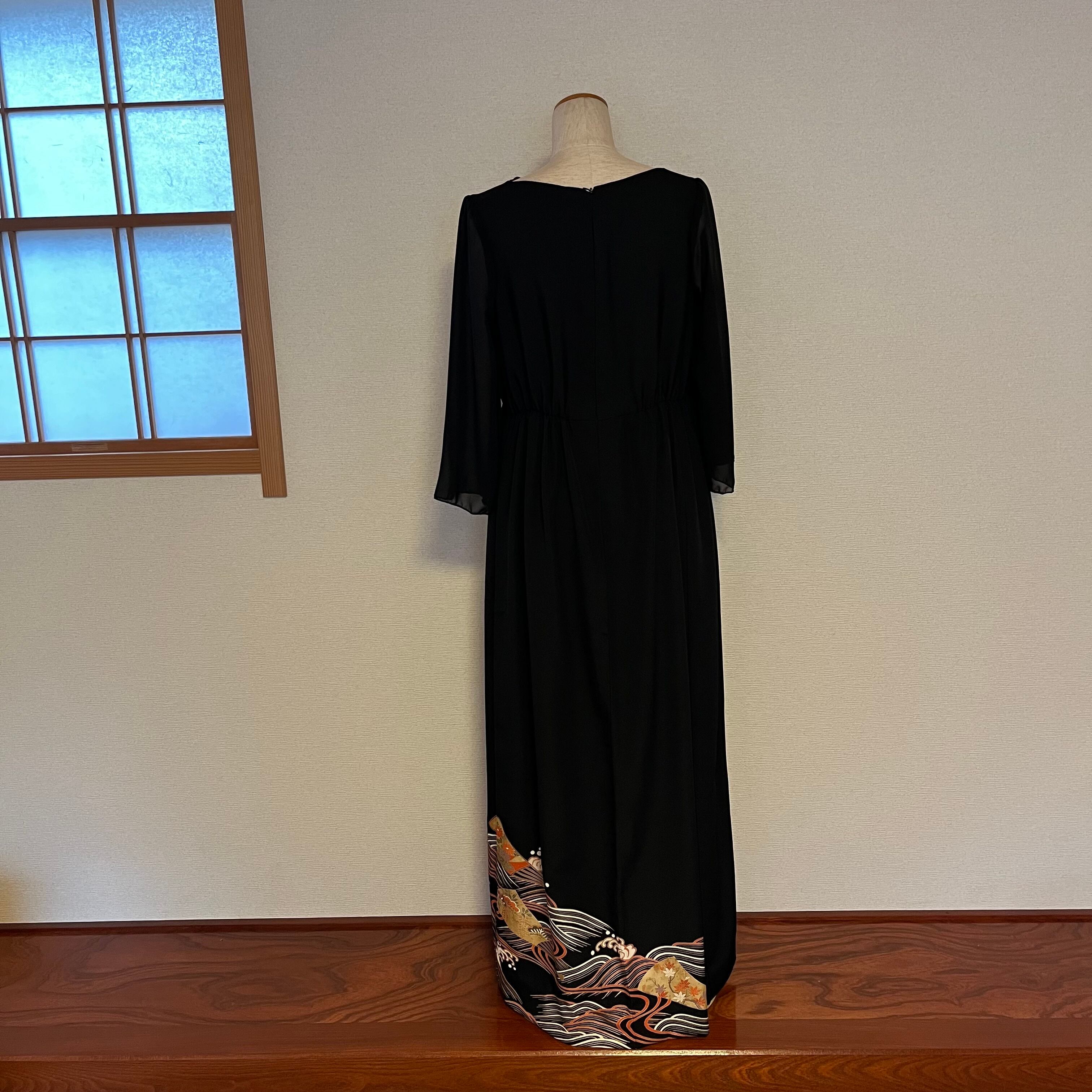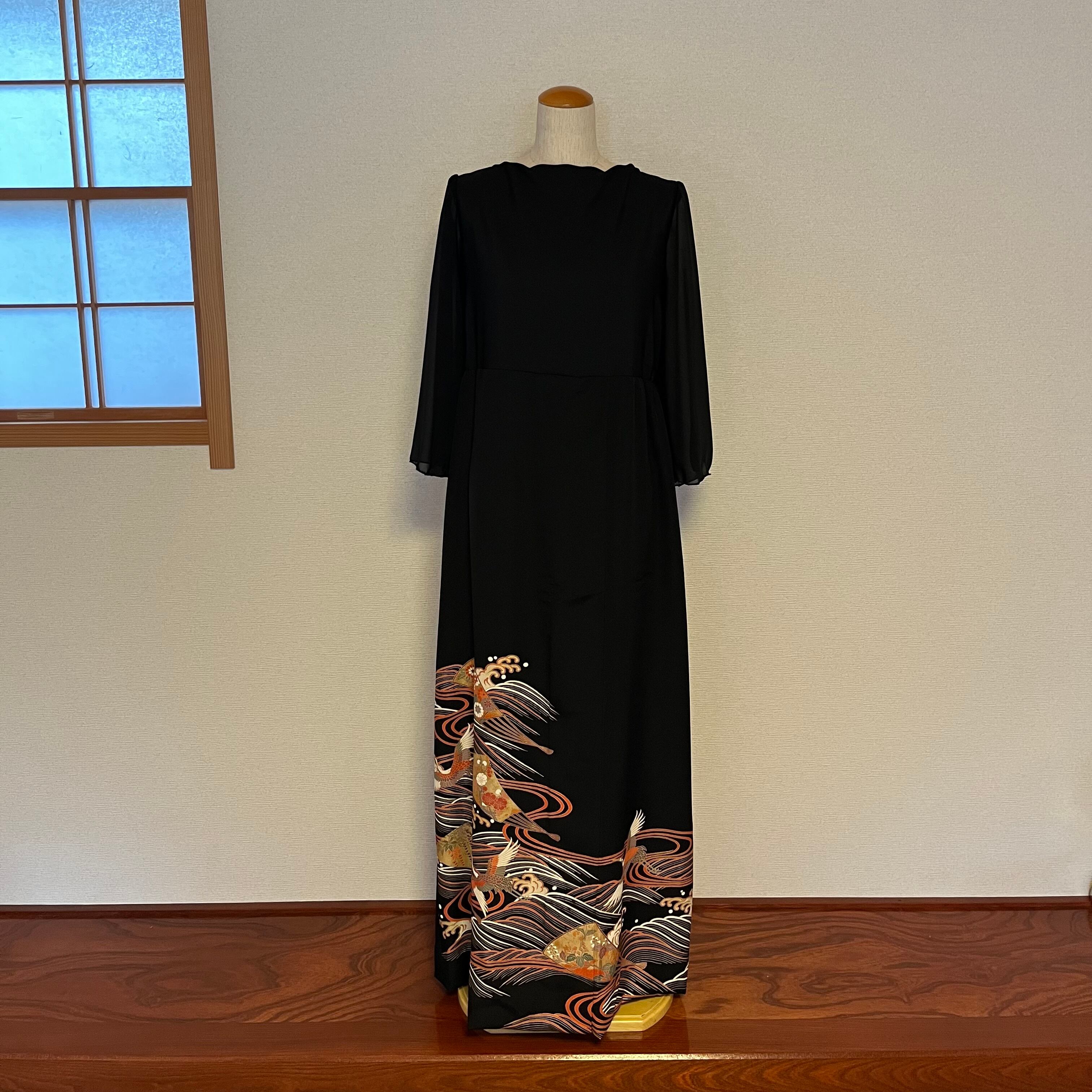 留袖リメイクドレス胸元ドレープ M〜Lサイズ 波飛鶴扇