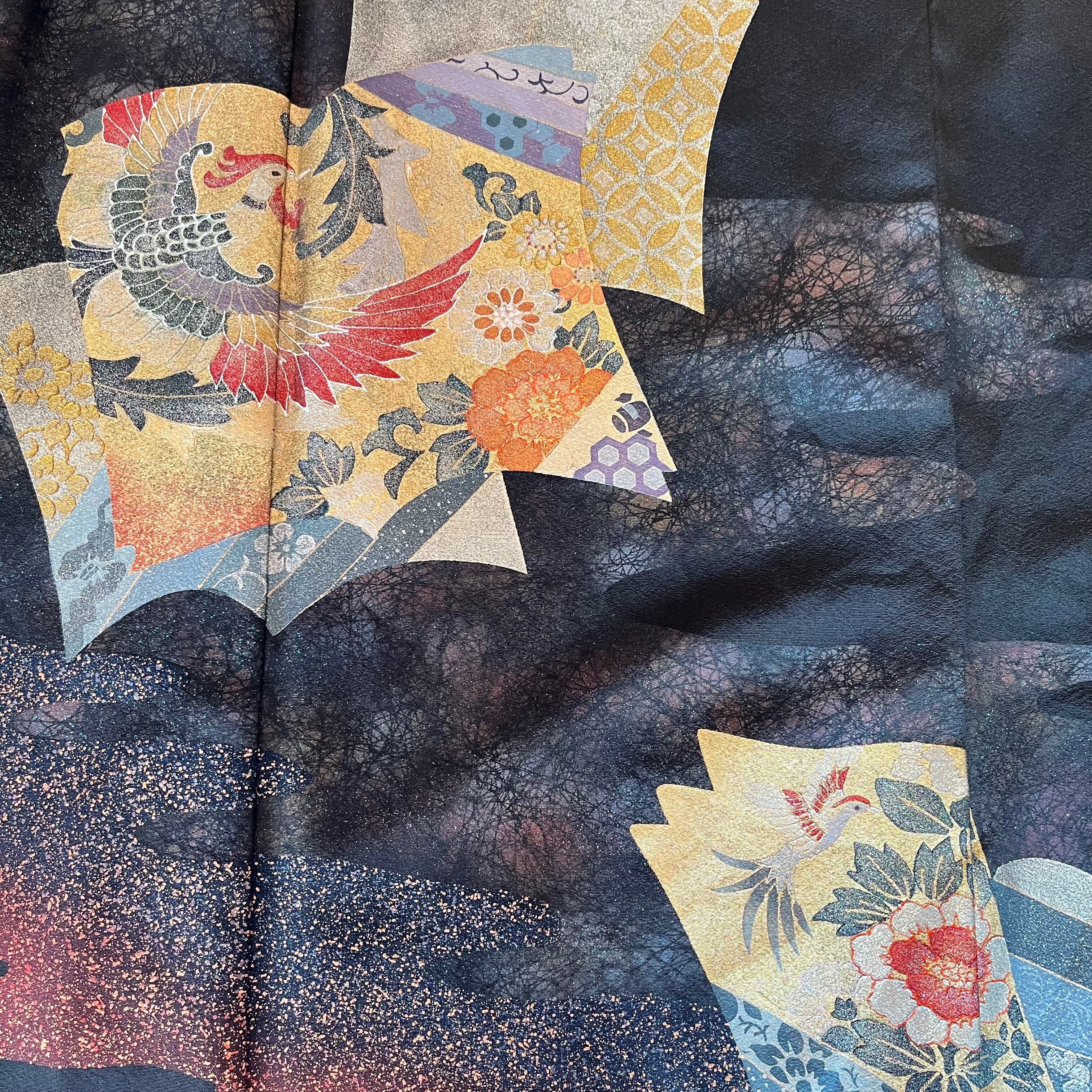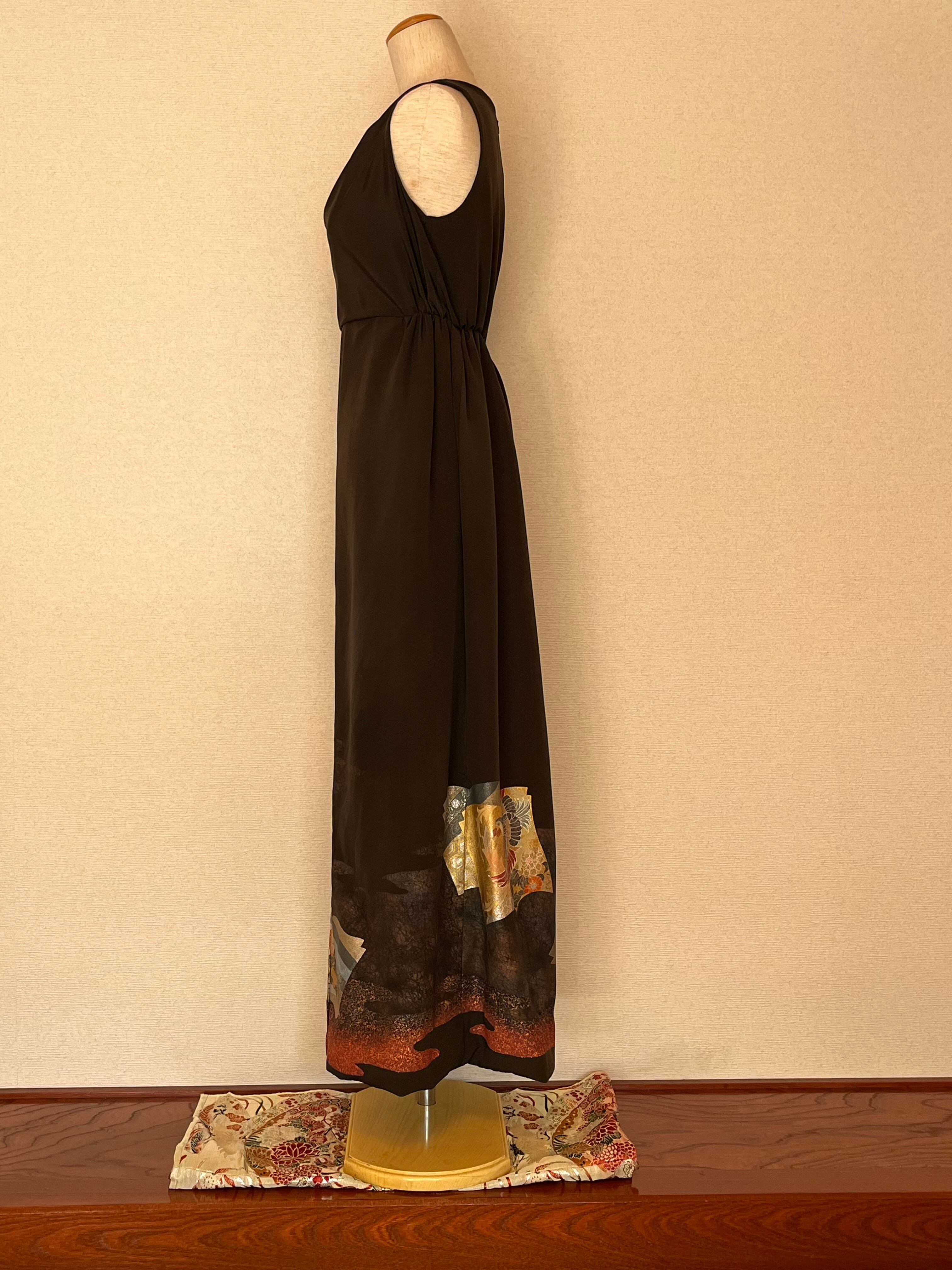 留袖リメイク胸元ドレープドレス 作家物金箔絵草子 S〜Mサイズ