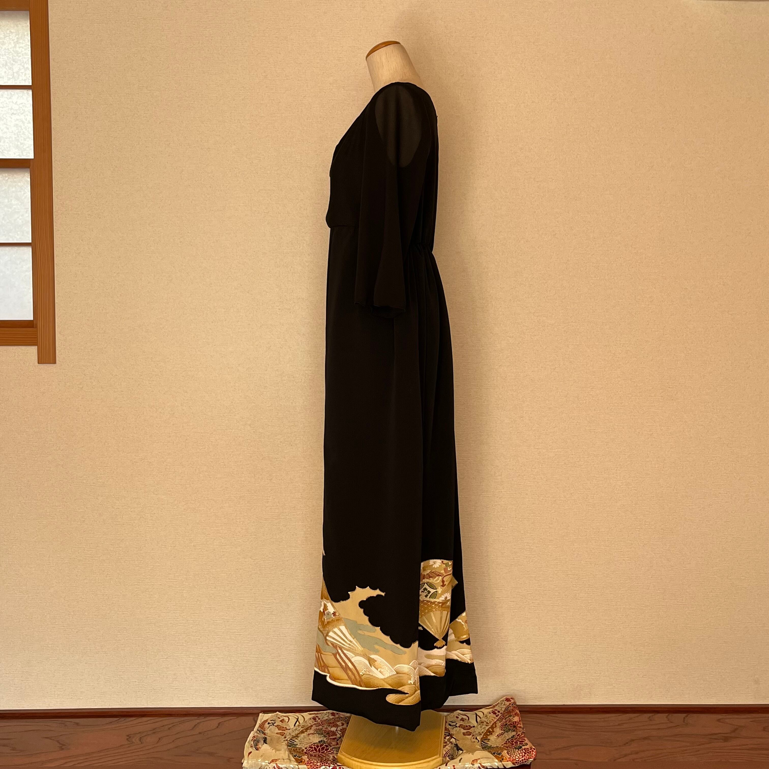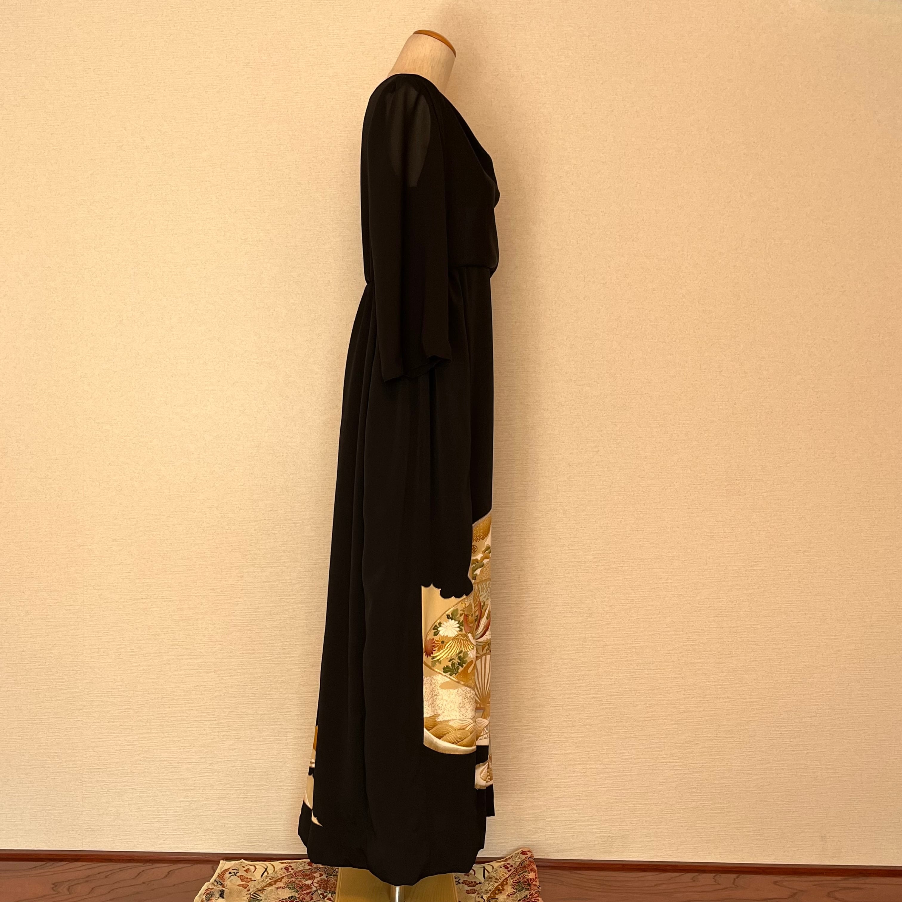 扇流し文様です。松、鳳凰、菊などの四季の花木と波文様描かれており、縁起の良い留袖より仕立てました。