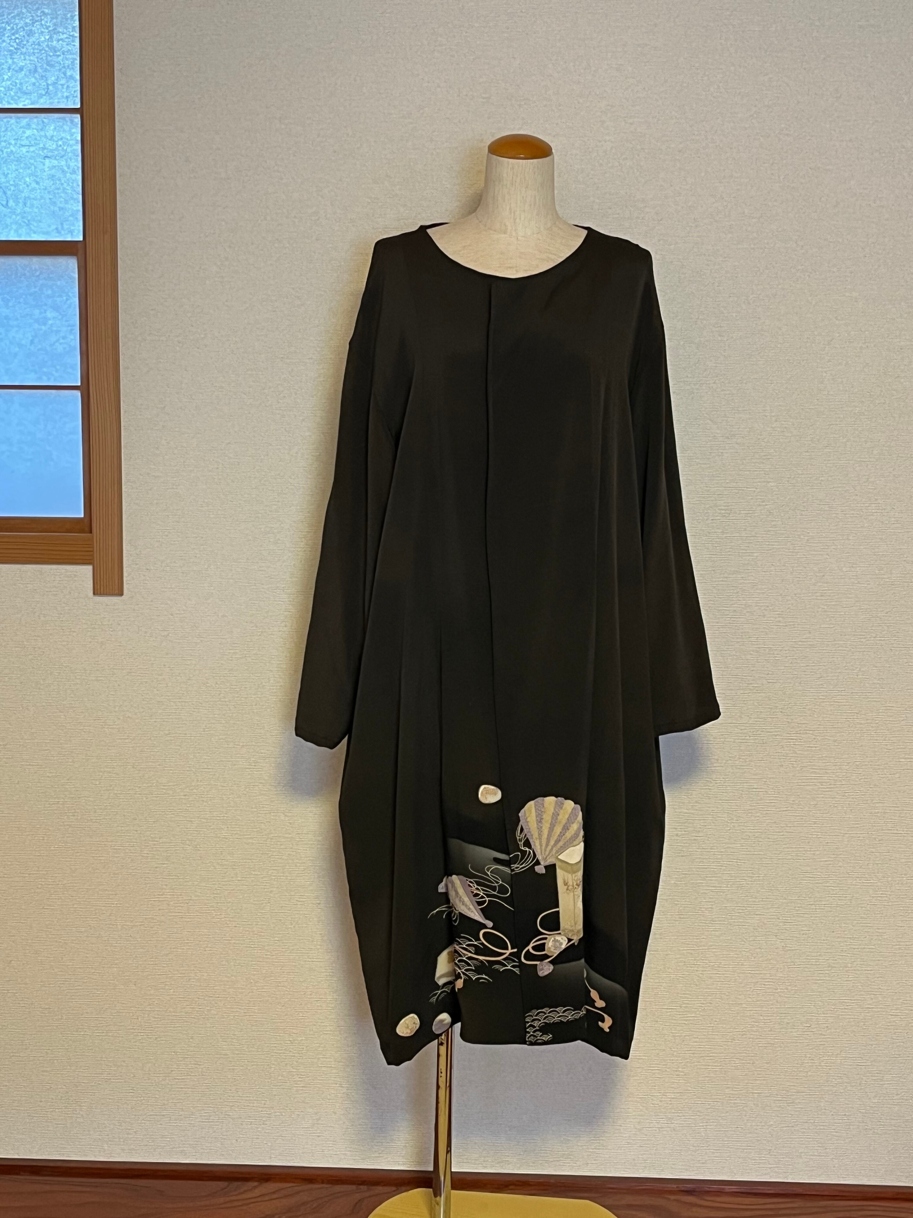 黒留袖から軽いはおりものを作りました。黒留袖の美しさを引き立てる、シンプルで上品なデザイン。サイズや年齢を問わず、どなたにもお召しいただけるエイジレスな一枚です。軽やかな着心地で、気軽に着用いただけます。