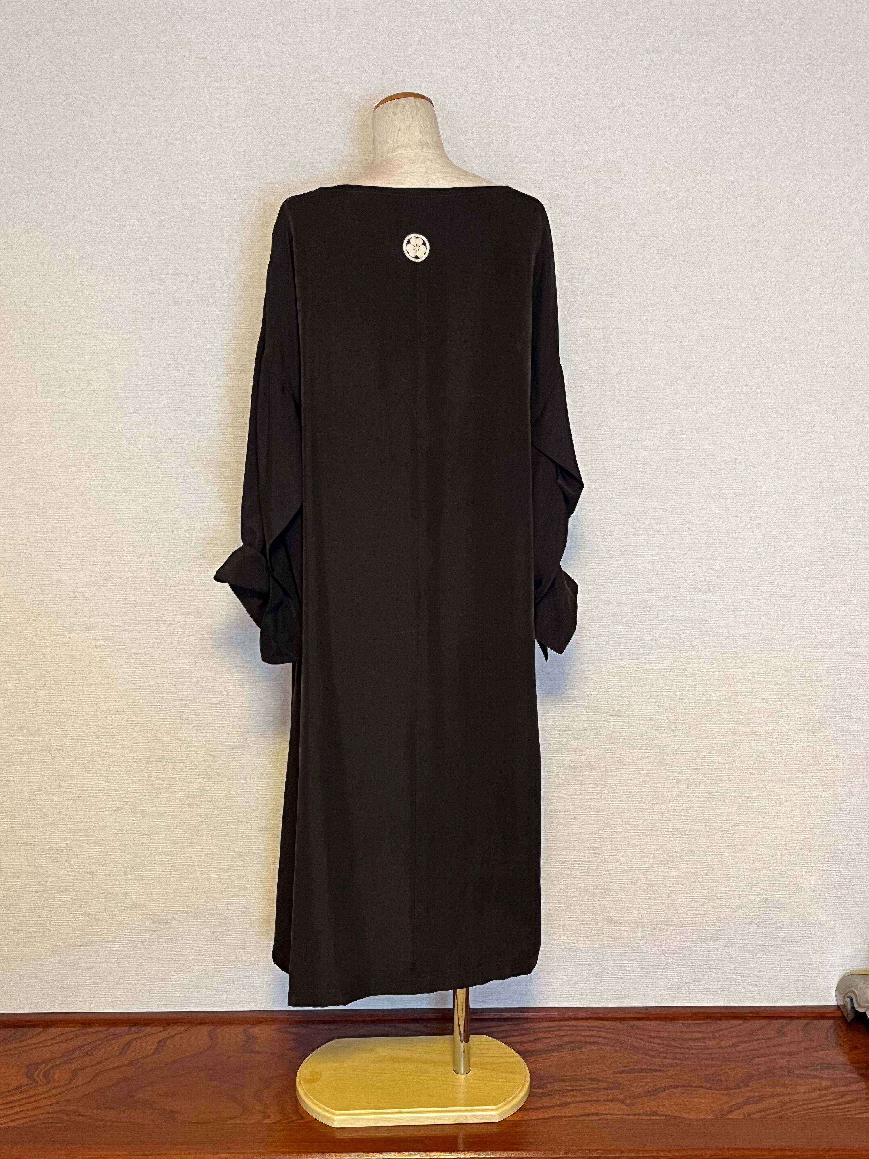 男物こげちゃ紋付から生まれたサイズレスワンピース。男性の伝統的な紋付きをリモデルし、女性が着やすいワンピースに仕上げました。シンプルなデザインながら、紋付きのエッセンスを残し、モダンな雰囲気に仕上げました。