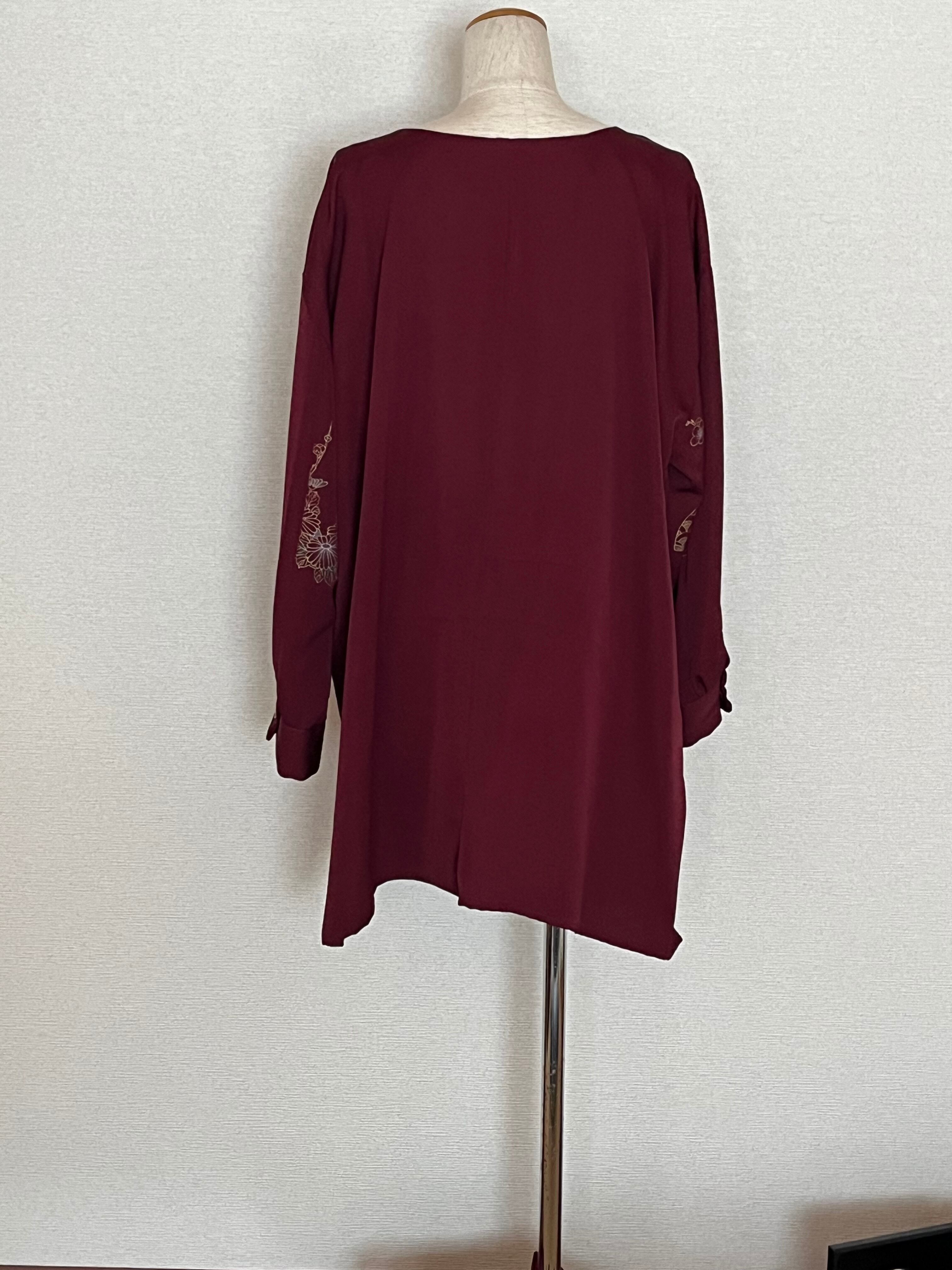 濃い葡萄酒色が美しいツーピースセット。和のエッセンスを取り入れつつ、洋風のスタイリッシュさも兼ね備えた一着です。上品で落ち着いた色合いは、どんなシーンでも活躍してくれること間違いなし。