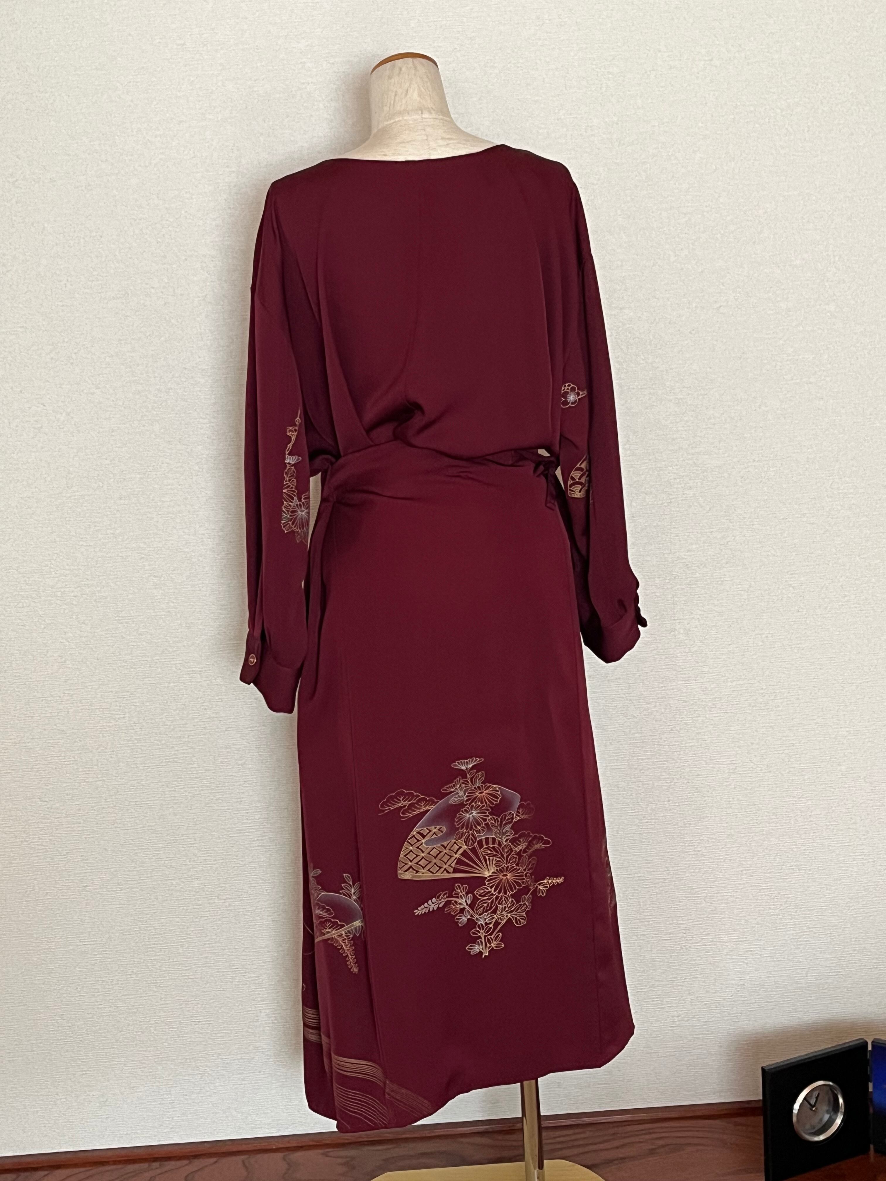 このツーピースは、濃い葡萄酒色の付け下げキモノから生まれました。個性的な柄や色合いを生かしつつ、モダンなデザインに仕上げました。日本の伝統と現代の美学が融合した逸品です。