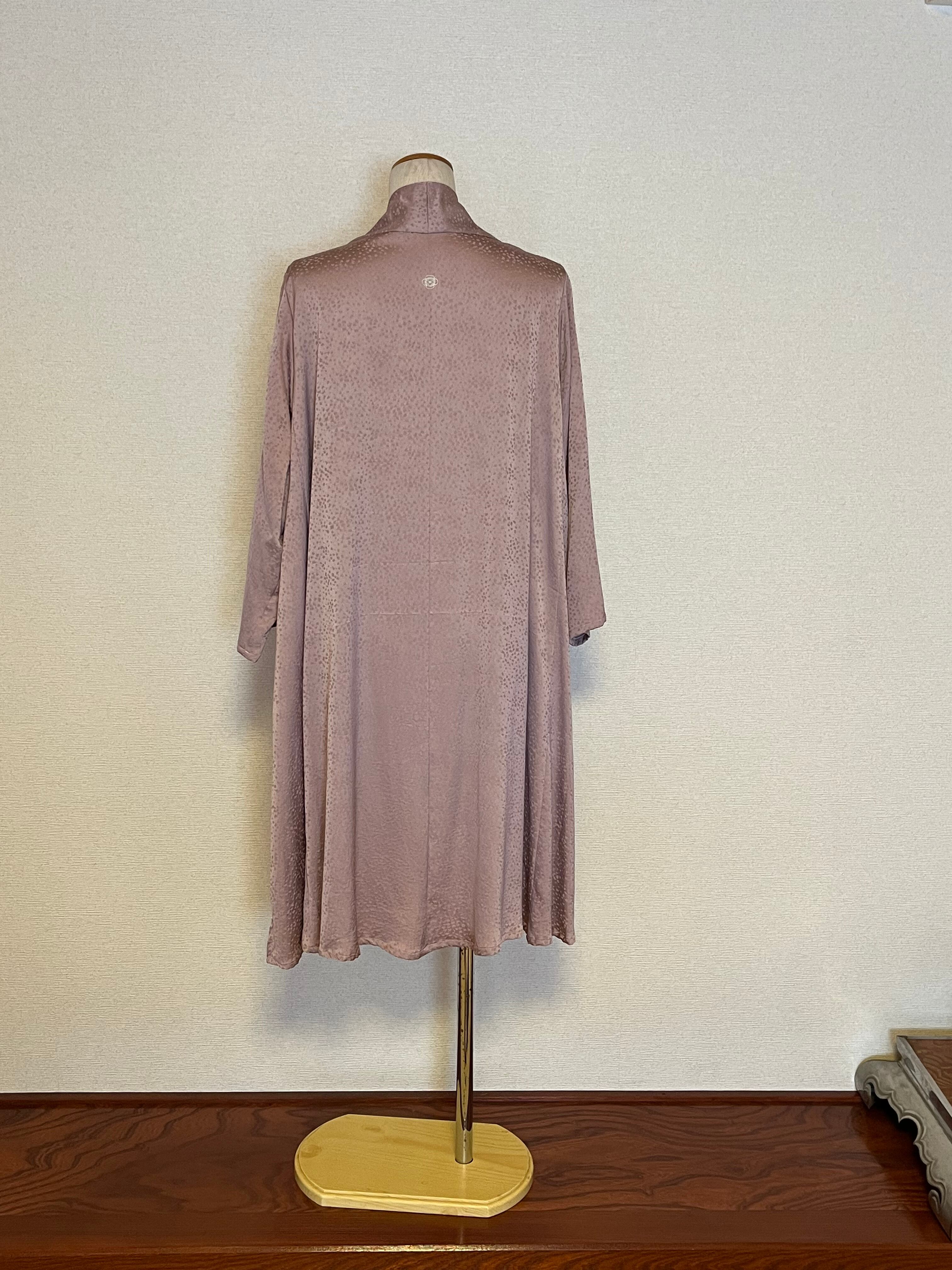 優雅な藤色一つ紋の着物生地を使用し、Aラインシルエットが特徴のこのアイテムは、特別な日にも普段使いにも最適です。軽やかな生地感は、動くたびに美しい揺れを生み出し、洗練された印象を与えます。