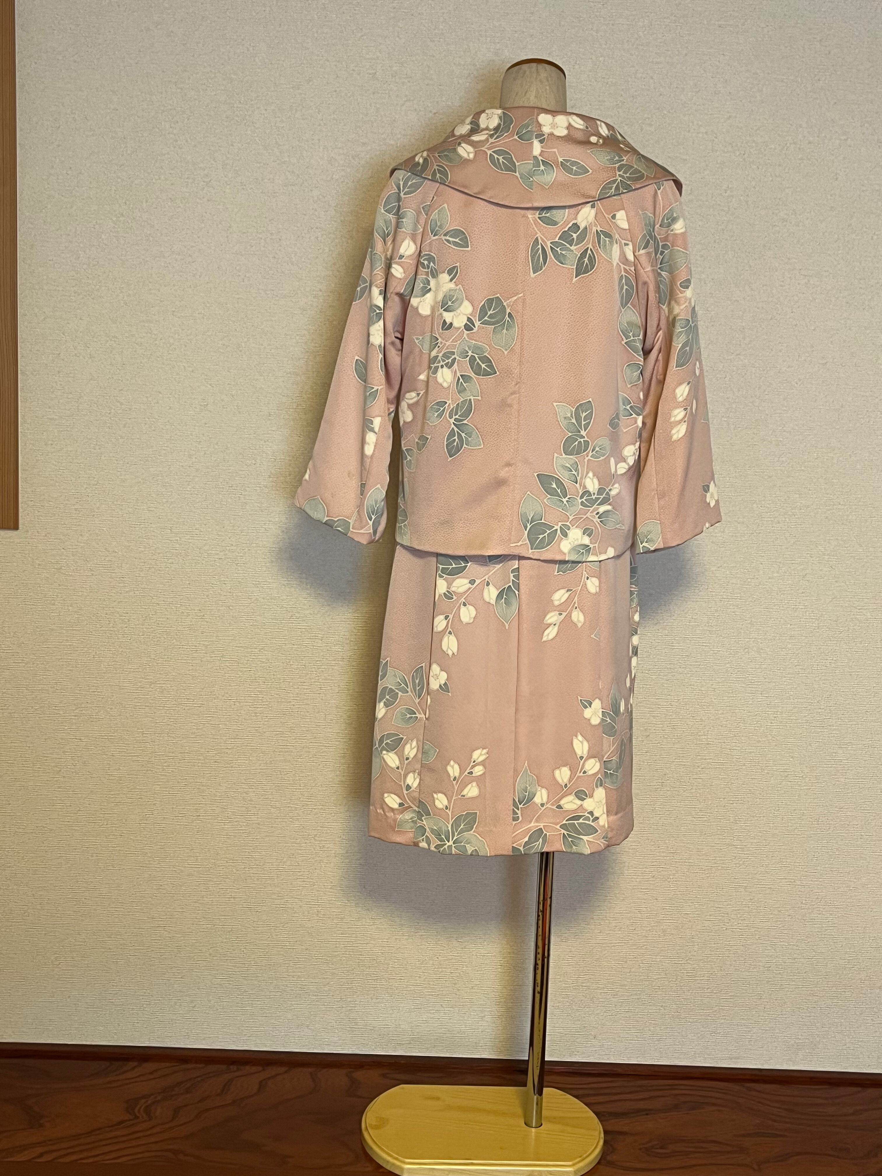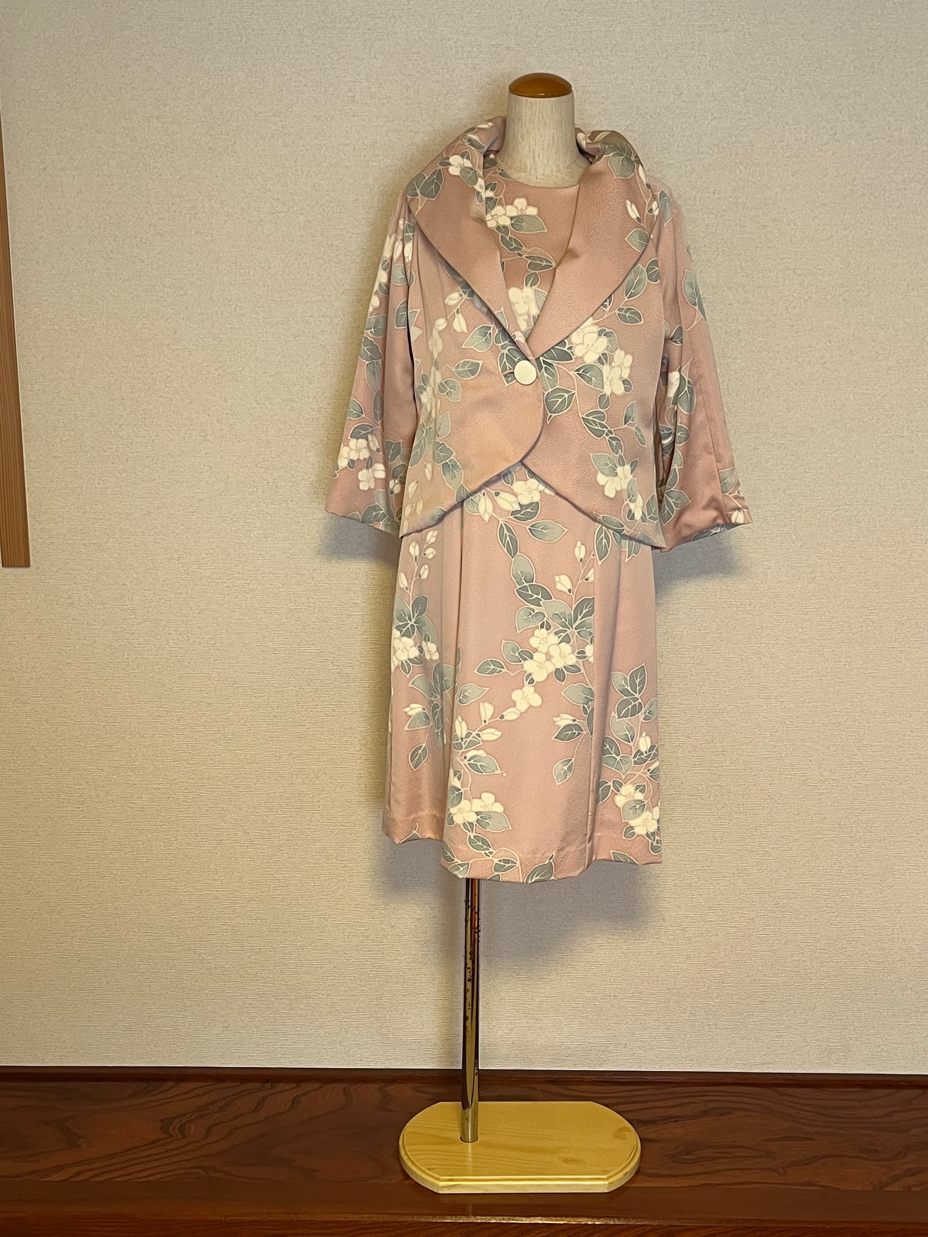 この桜色小紋から作られたアンサンブルは、上品な雰囲気と華やかさが魅力。繊細な小紋柄がおしゃれさを引き立て、春らしい女性らしいイメージを演出します。さらに、程よい肌触りで、後ろファスナー開きで、着心地も抜群です。