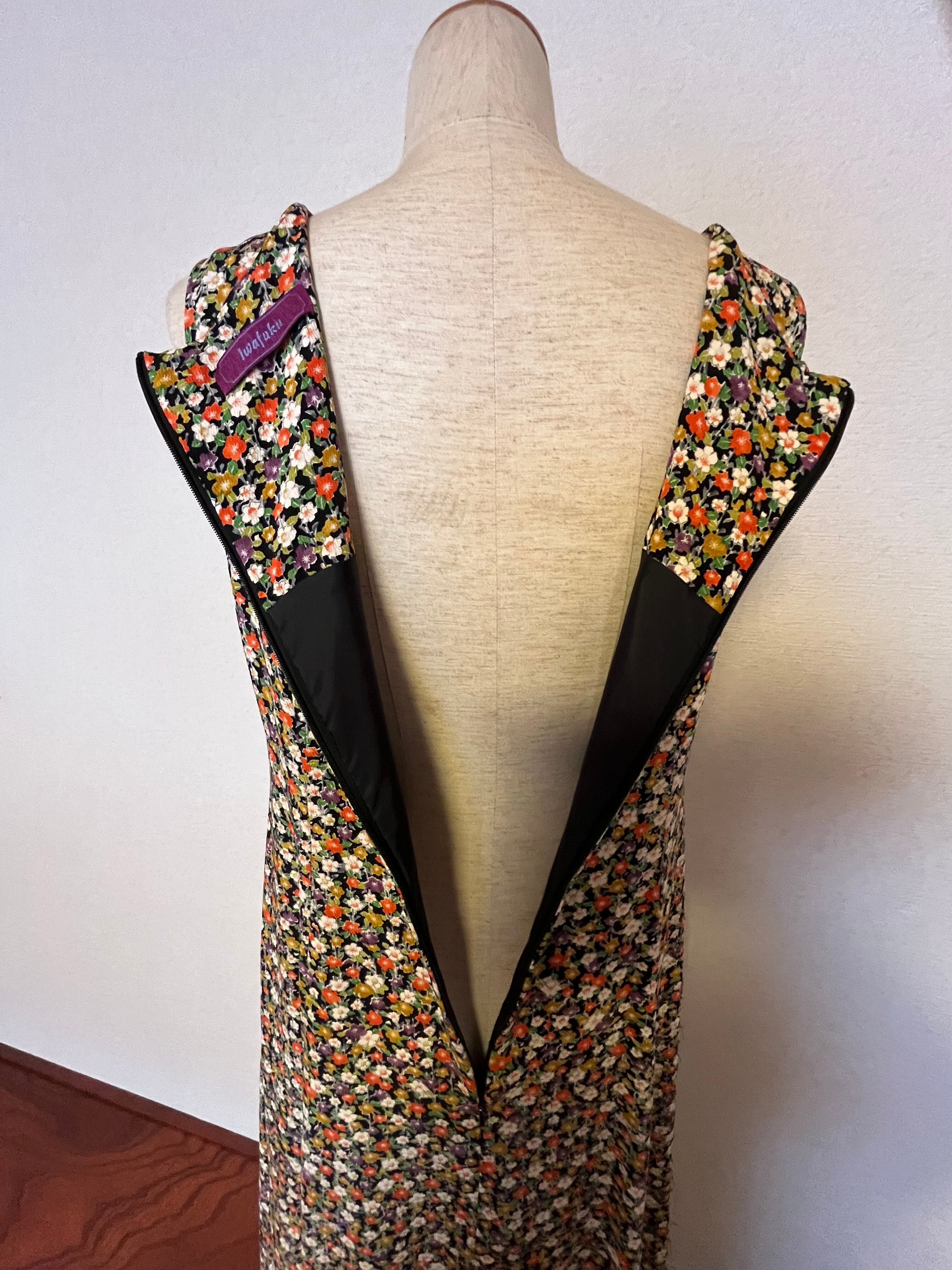 黒地に小紋花柄が印象的な後ろファスナー開きワンピースをご紹介します。背中のファスナー開きデザインが、シンプルな中にも遊び心を感じさせ、後ろ姿もおしゃれに演出してくれます。華やかな花柄が、女性らしさを引き立てる一枚です。