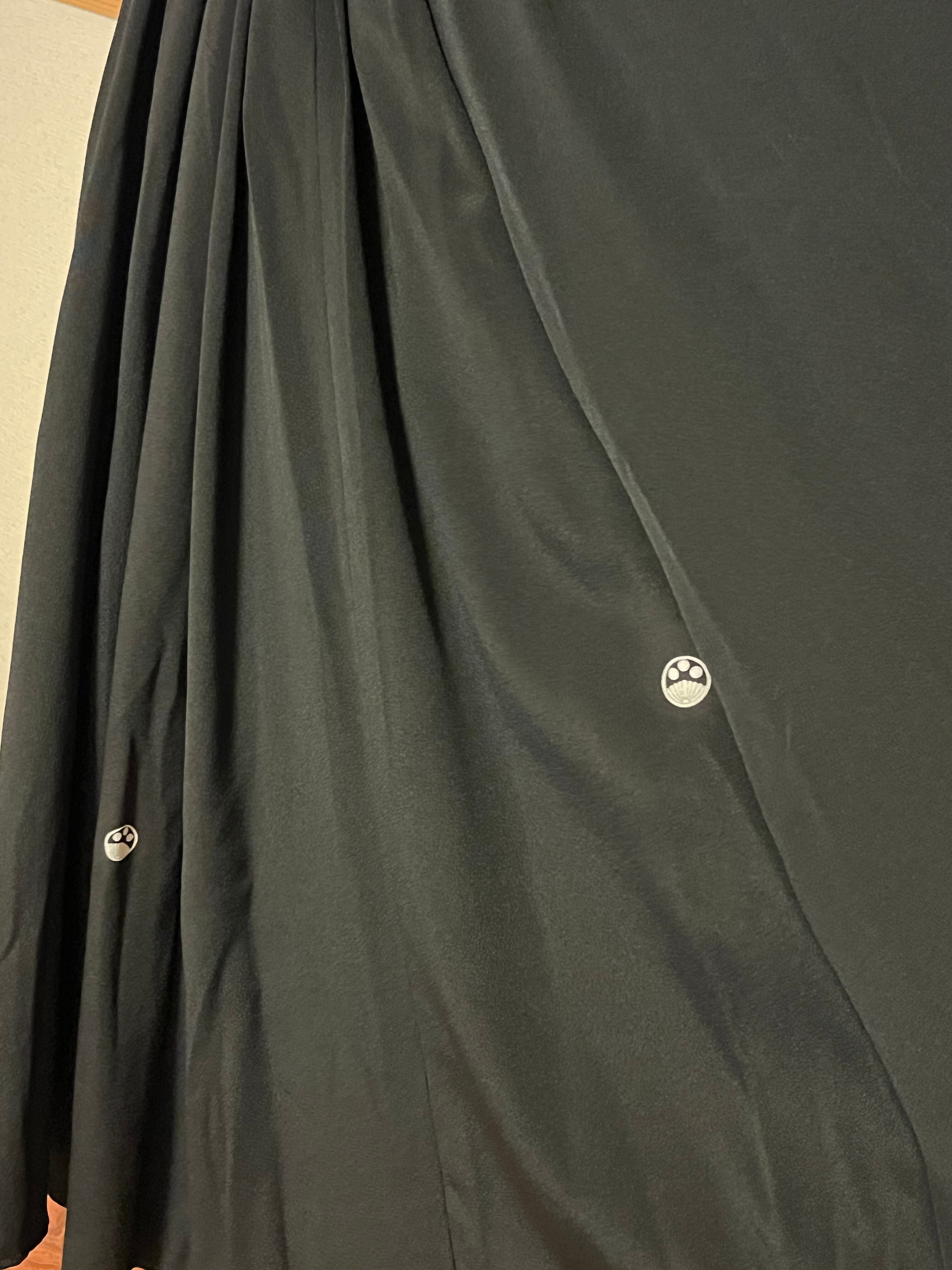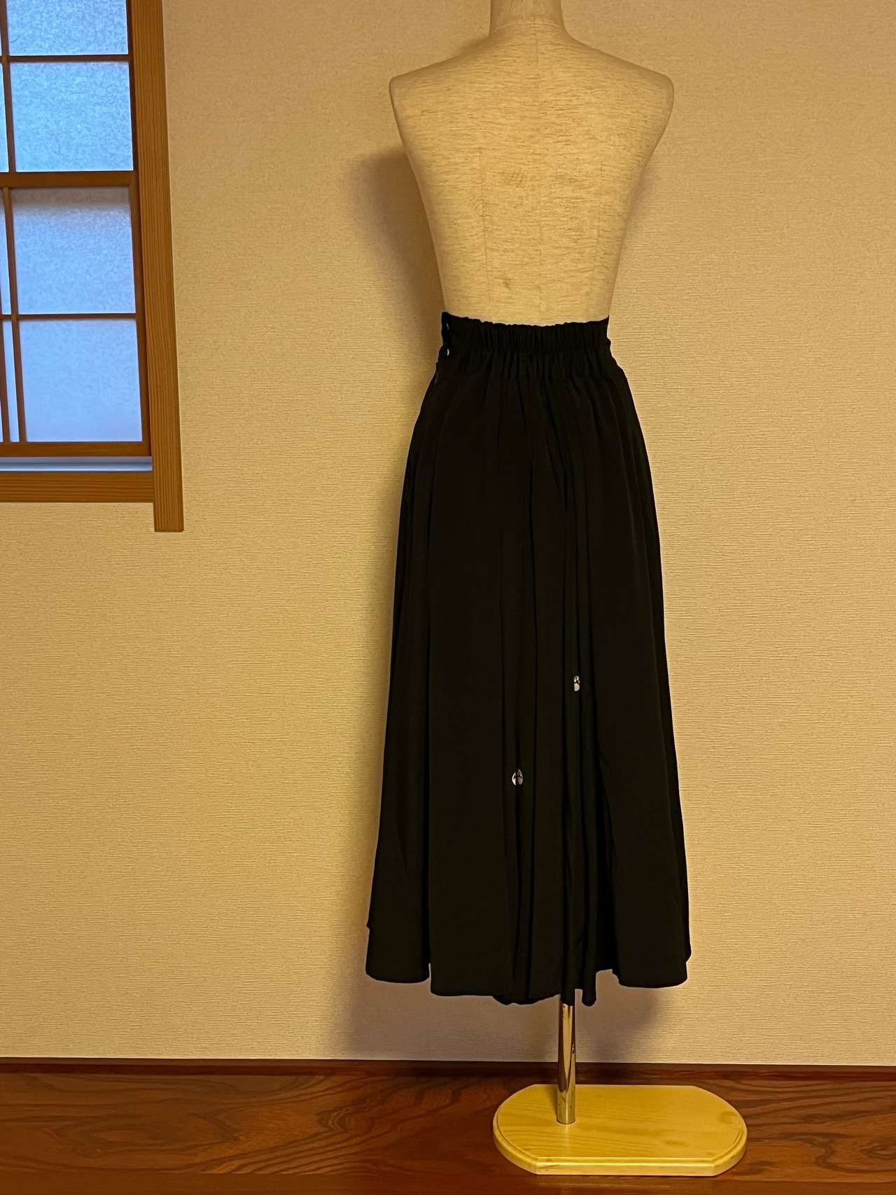 黒留袖の黒地の部分と紋少しを使用して、エレガントで美しいデザインに仕上げました。ボリューム感のあるサーキュラースカートは、歩くたびに揺れる姿が女性らしさを引き立てます。ウエスト部分はゴム入りで、着心地も快適です。